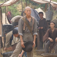 Gao had thick black hair when he auditioned for Iron Road; but when he was cast as Wang Ma, he shaved his entire head to wear the 1880’s Manchu wig with its traditional long queue. In the story, the camp cook cuts off his queue as soon as he arrives in the railroad camp.